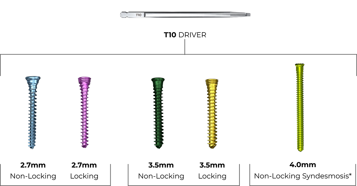 To help improve ease of use and reduce OR time, ALPHALOKTM features a modular tray system with color-coded implants and instrumentation. All screws are also inserted with the same T10 Driver.